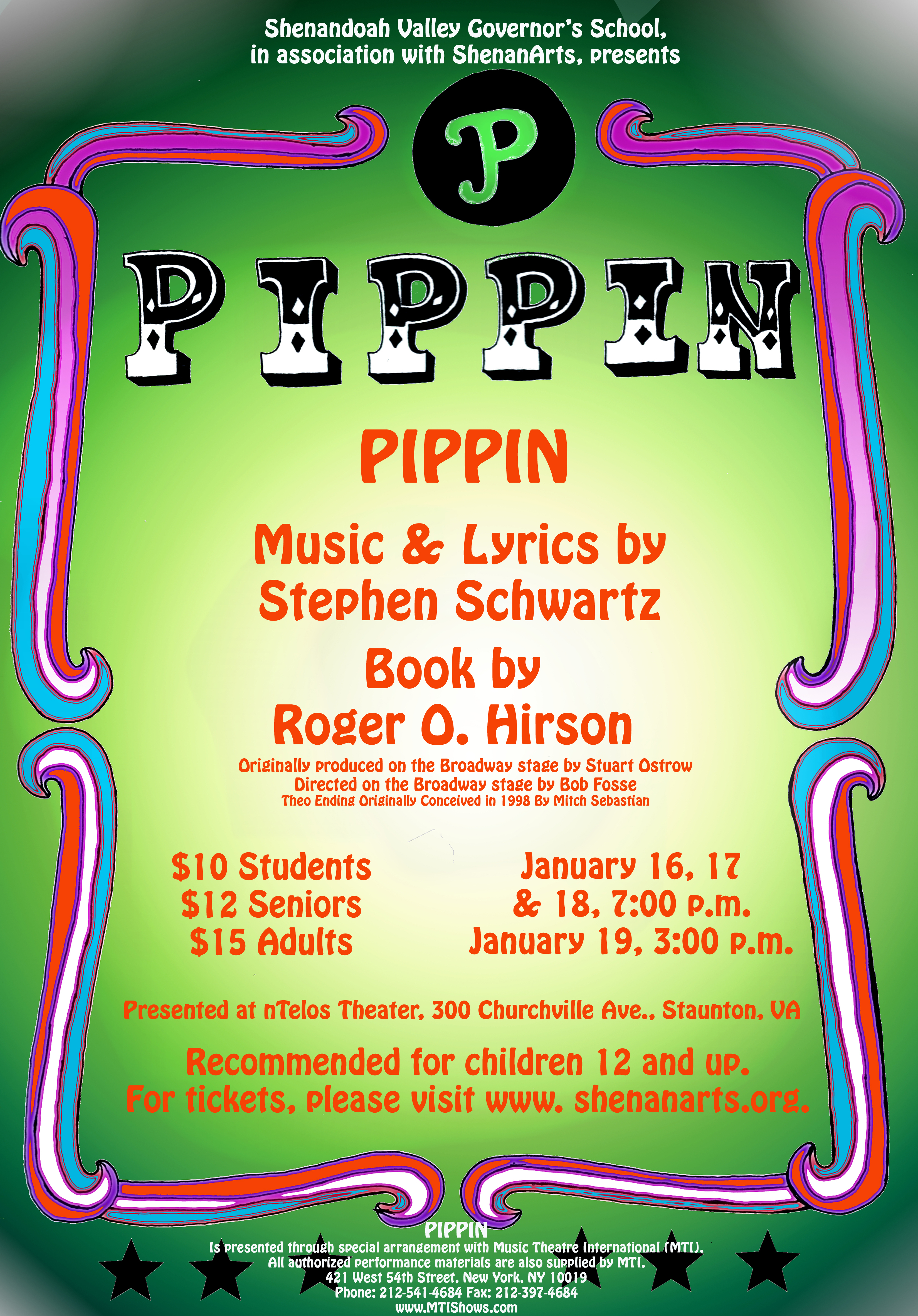 The Shenandoah Valley Governor’s School, in association with ShenanArts, is proud to present Pippin,music & lyrics by Stephen Schwartz and book by Roger O. Hirson. In this fairy-tale-with-a-twist, a high-energy troupe of circus players helps (or hinders) Prince Pippin in his quest for true happiness.
