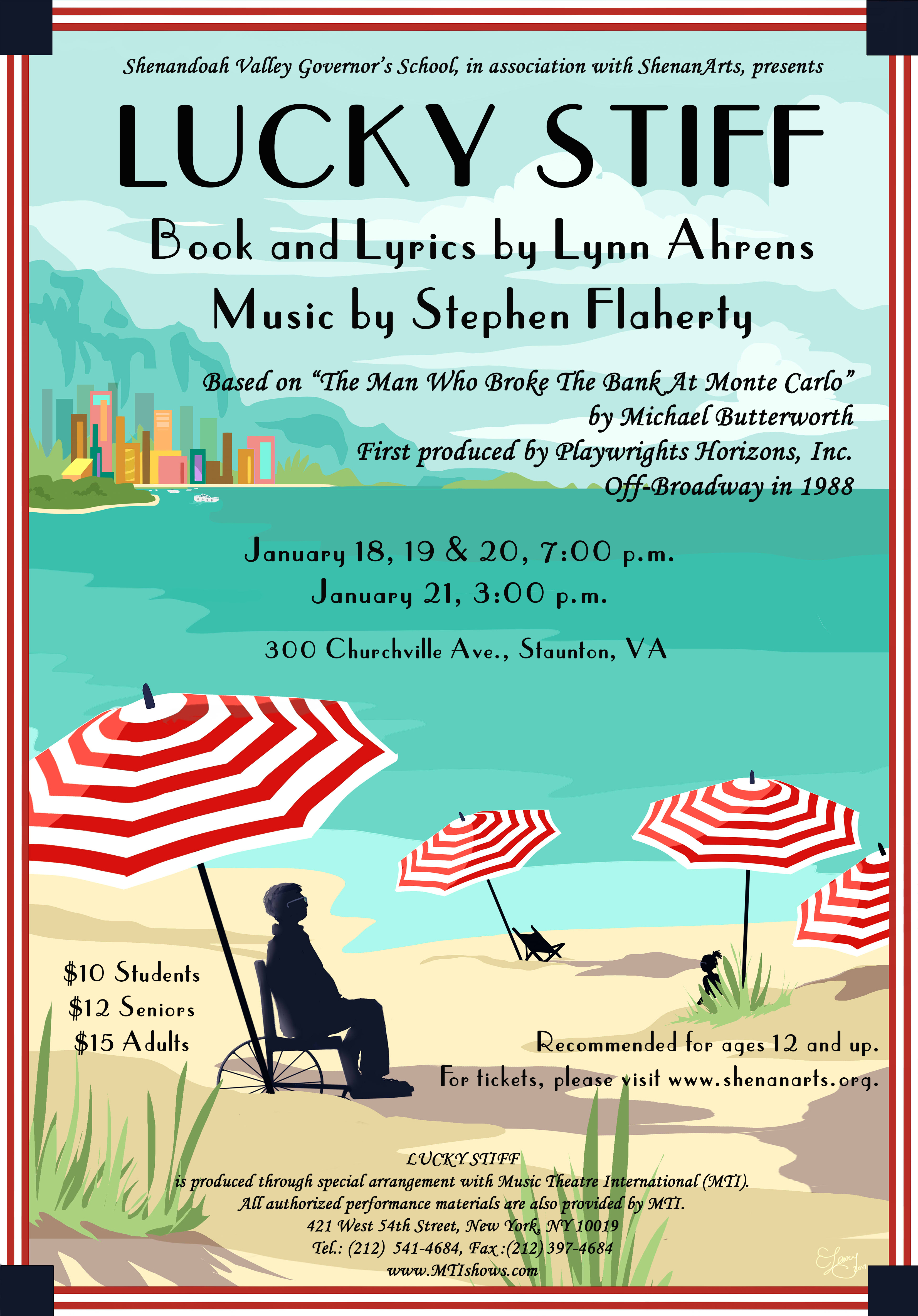 The production is under the musical direction of Christine Nielsen and is choreographed by Lindsey Walters (SVGS class of 2005). Cori McDaniel (SVGS class of 2010) serves as lighting designer, with set design by Diane Stewart and graphic design by SVGS art junior Emily Leary. Dawn Davis, Kate Delaney, Donna Morris Susan Polly, and Susan Vass undertake the task of creating costumes for over 30 characters, with additional costume pieces designed and built by Brecken Geiman and her costume design students. Lucky Stiff is produced through special arrangement with Music Theatre International (www.MTIShows.com). Lucky Stiff is based on “The Man Who Broke The Bank At Monte Carlo” by Michael Butterworth and was first produc ed by Playwrights Horizons, Inc. Off-Broadway in 1988.