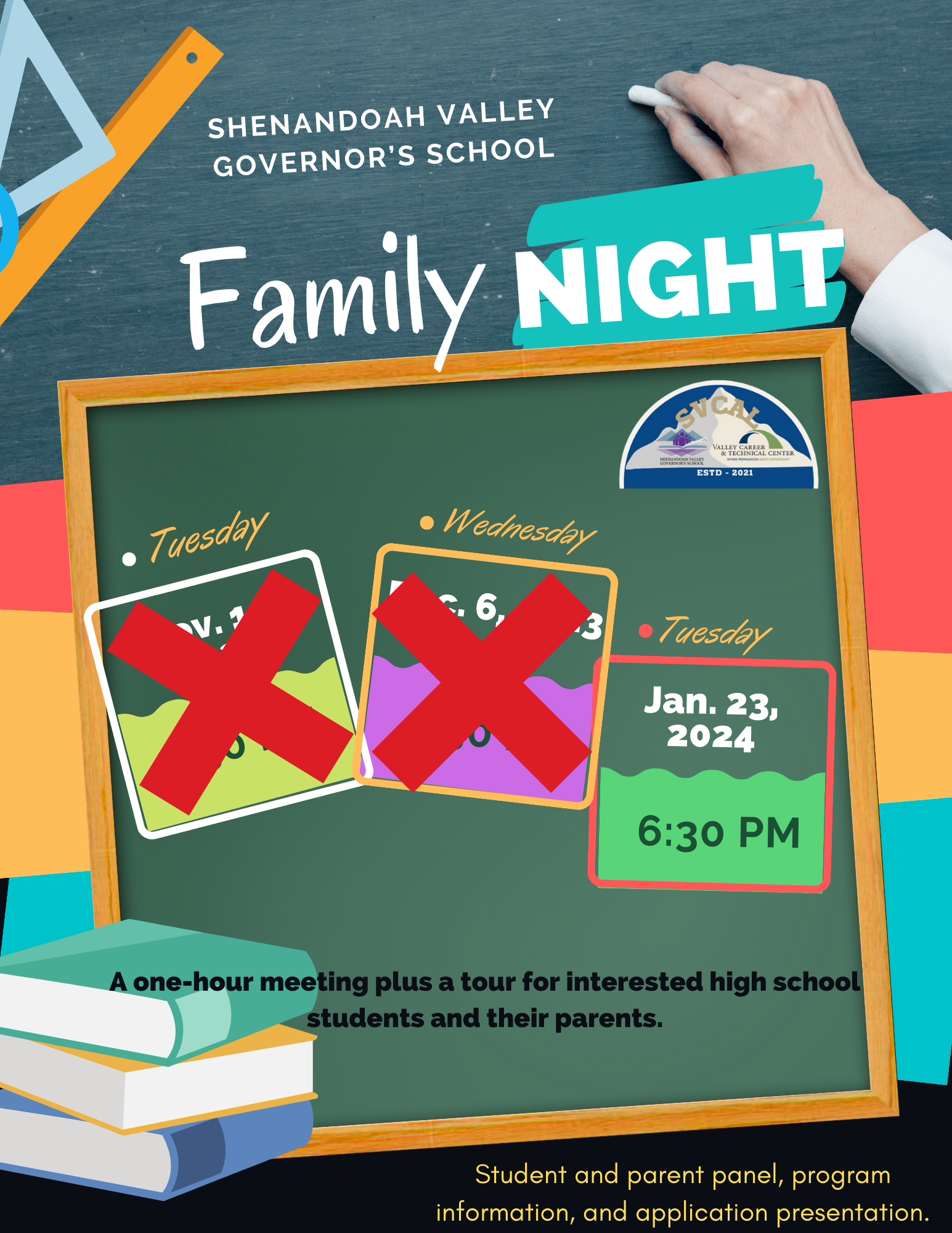 If you’re considering applying to SVGS for the 2024-2025 school year, please plan to attend the final Family Night on Tuesday, Jan. 23rd at 6:30 P.M. This hour-long session will include a panel featuring students and parents, program information, and an application presentation.