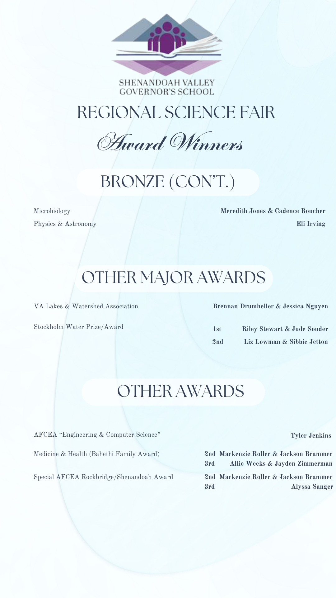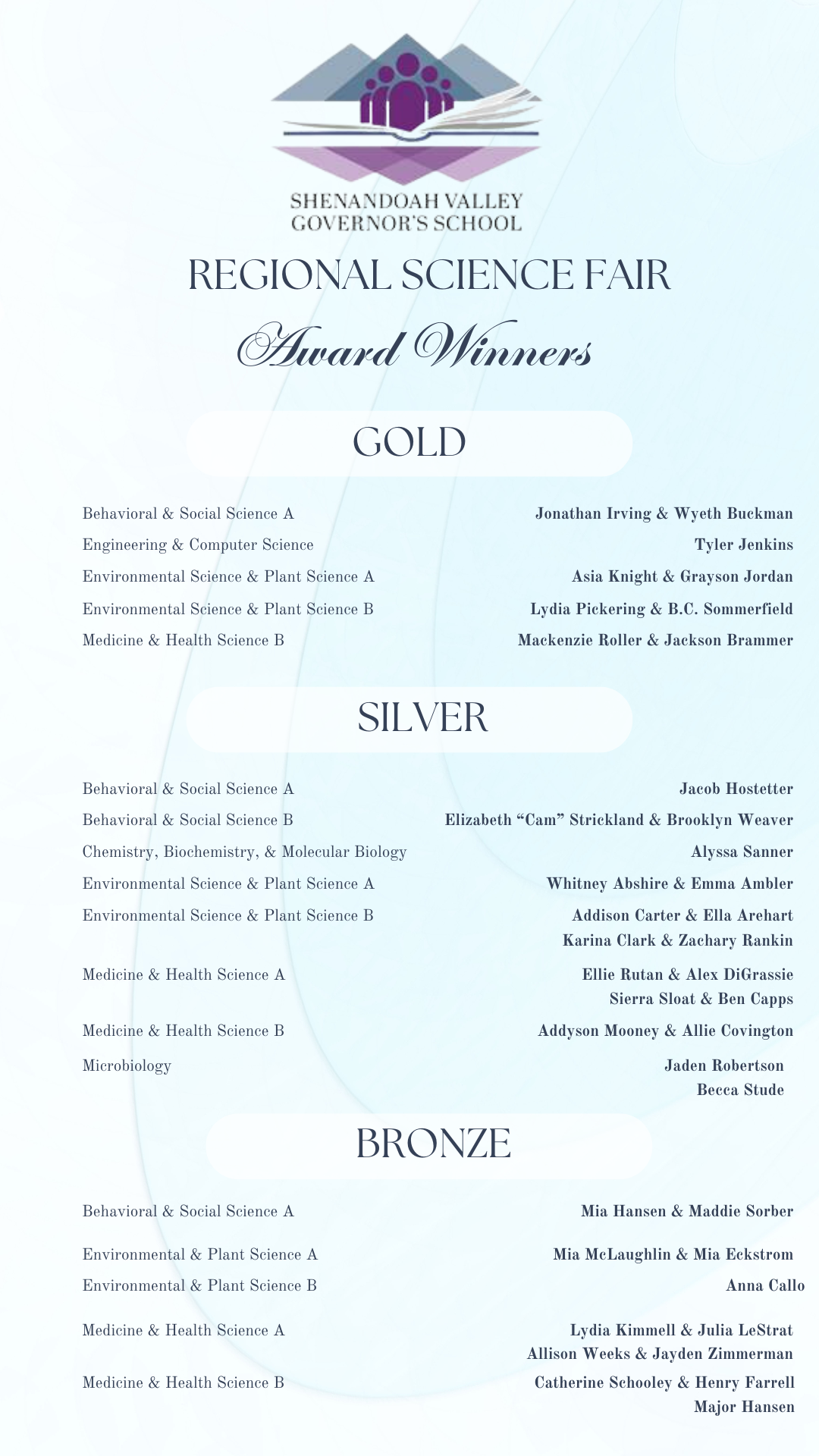 Congratulations to the award winning students who participated in the Shenandoah Valley Regional Science & Engineering Fair on Tuesday, March 12th at J.M.U. Our SVGS students won 5/10 categories in GOLD; 8/10 categories in SILVER; and 6/10 categories in BRONZE. We also had students who won other major awards (monetary). Our five gold winners are now eligible to compete at the state level. Kudos to these students and their teachers.