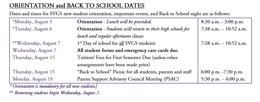 Dates and times for SVGS new student orientation, important events, and Back to School night are as follows: