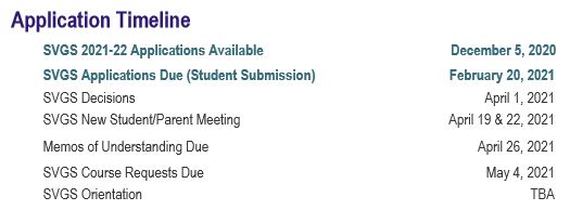 Applications for the 2021-22 school year will be available Dec. 5, 2020. The deadline to submit SVGS applications for 2021-22 is February 20, 2021.